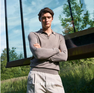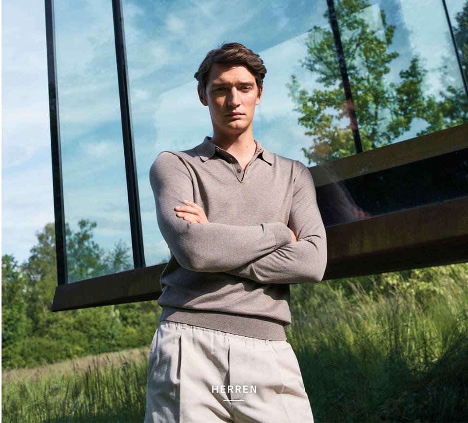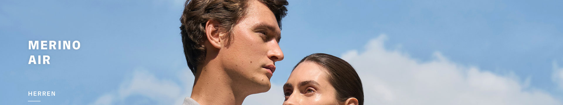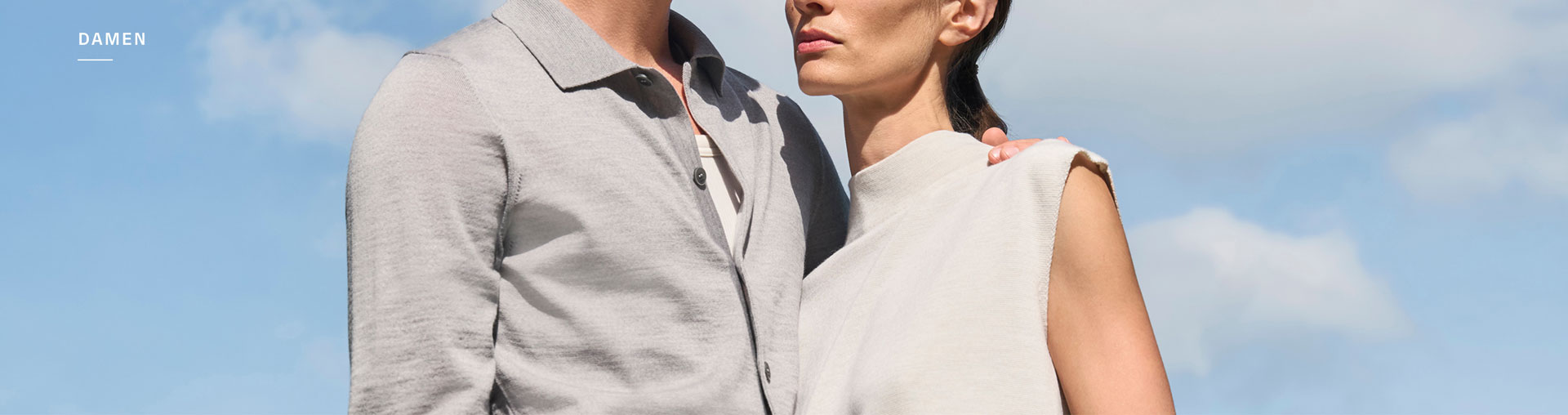 Mann und Frau in leichten Merino Air Looks, modern vor blauem Himmel inszeniert – extrafeiner Strick für luftige Premium Ästhetik.