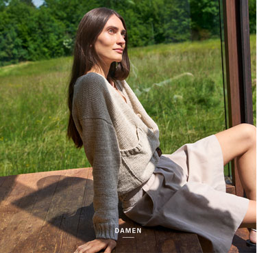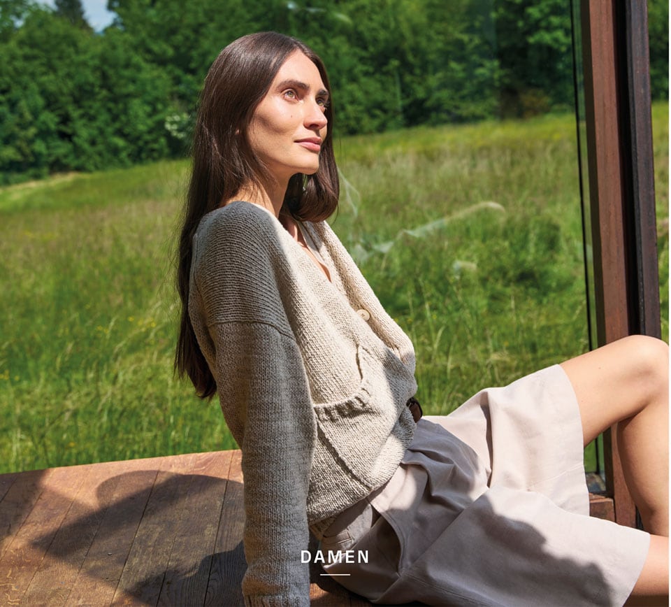 Look 1 entdecken: Our Favourite New Looks: Frau in langem, cremefarbenem Strick Ensemble mit offenem Cardigan, ruhig im Studio vor heller Wand inszeniert, leichte Premium Strickqualität.