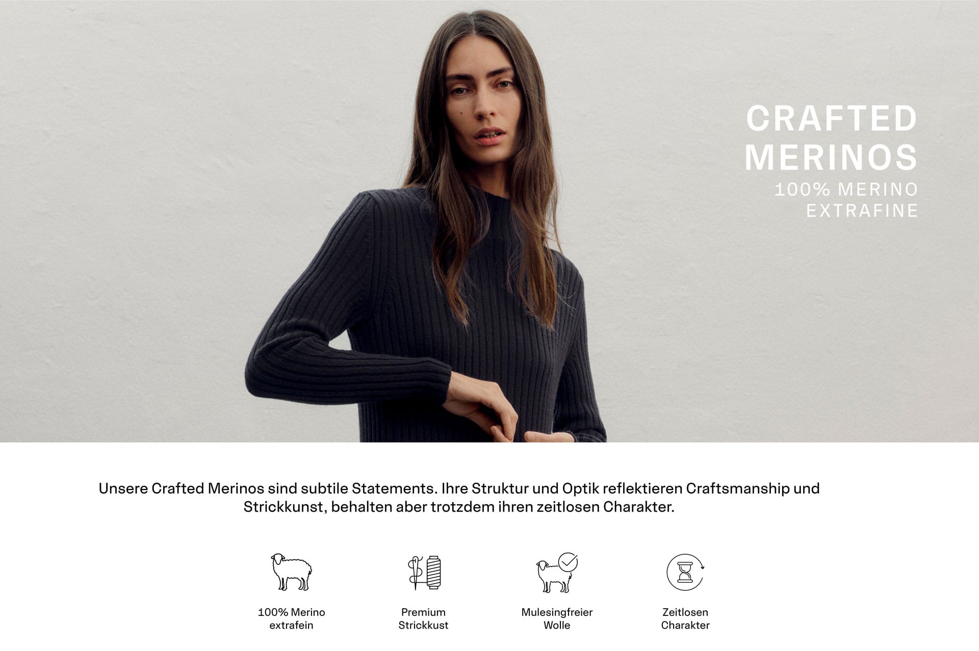 CRAFTED MERINOS 100% MERINO EXTAFINE. Unsere Crafted Merinos sind subtile Statements. Ihre Struktur und Optik reflektieren Craftsmanship und Strickkunst, behalten aber trotzdem ihren zeitlosen Charakter. Icons: 100% Merino extrafein. Premium Strickkust. Mulesingfreier Wolle. Zeitlosen Charakter.