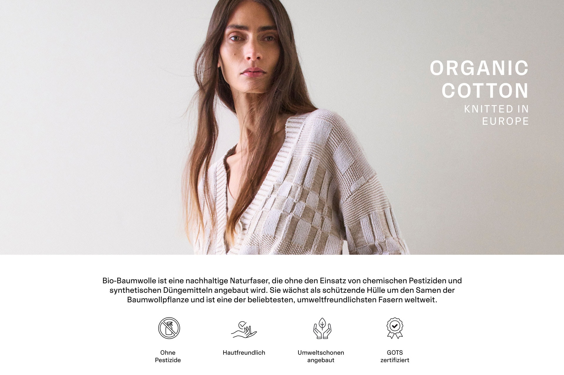 Organic Cotton Strickjacke in hellem Ton an einer Frau, hochwertig gefertigt und weich auf der Haut für moderne, natürliche Looks.