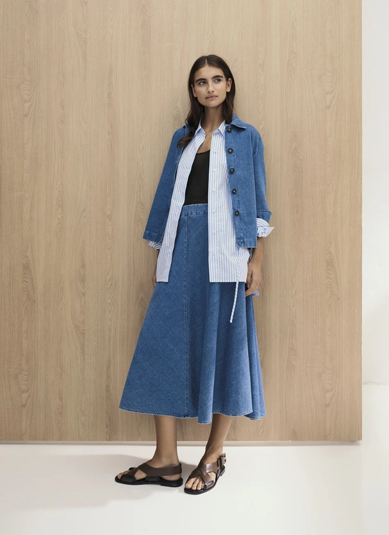 Dieser ausgestellte Rock aus einer Denimqualität mit Baumwolle und Leinen verbindet Struktur mit natürlicher Leichtigkeit. Das Material fühlt sich angenehm fest an, bleibt dabei jedoch atmungsaktiv und sorgt für ein komfortables Tragegefühl – ideal für den Alltag. Der ausgestellte Schnitt verleiht dem Rock eine feminine Silhouette, während Bund und Reißverschluss für eine präzise Passform sorgen. Zwei seitliche Taschen ergänzen das Design um praktische Funktionalität und eine lässige Note.
