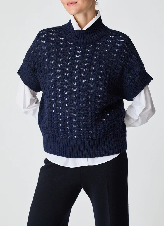 Moderner Damen-Pullunder mit ausdrucksstarkem Strickdesign. Das markante Muster und auffällige Rippenstrukturen verleihen dem Look eine selbstbewusste Note. Die edle Materialmischung aus Schurwolle und Alpaka sorgt für natürlichen Tragekomfort – warm, weich und leicht. Mit seinem Modern Fit formt der Pullunder eine harmonische Silhouette. Ideal für stilvolle Layering-Looks in der kühleren Saison.