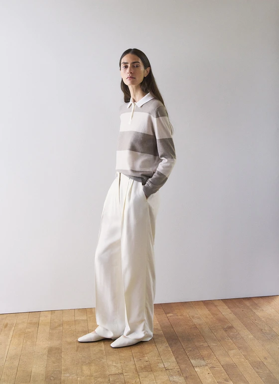 Der Damen Polo Pullover überzeugt mit Regular Fit und einem zeitlosen, breit gestreiften Design in zwei Farben. Der Polokragen setzt einen frischen, eleganten Akzent. Gefertigt aus einer hochwertigen Merino-Bio-Baumwollmischung bietet er angenehme Wärme, Atmungsaktivität und ein besonders weiches Tragegefühl. Bündchen am Saum und an den Ärmeln sorgen für eine gepflegte Silhouette und optimalen Sitz. Ein vielseitiges Strickstück für stilvolle Alltagslooks mit hohem Komfort.