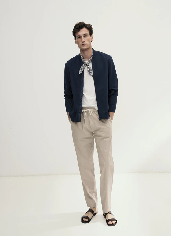 Diese Hose aus 100% Baumwolle überzeugt mit einer modernen Papertouch Qualität, die durch ihre angenehm trockene, leicht strukturierte Haptik sofort ins Auge fällt. Der elastische Bund sorgt für hohen Komfort, während Gürtelschlaufen zusätzliche Styling Optionen ermöglichen. Zwei seitliche Taschen sowie eine dezente Gesäßtasche bieten praktische Funktionalität. Im Regular Fit entsteht eine klare, ausgewogene Silhouette, die vielseitig kombinierbar ist – ob mit Poloshirt, Hemd oder Overshirt. Dank ihres leichten Tragekomforts eignet sich die Hose hervorragend für modische Alltagslooks.