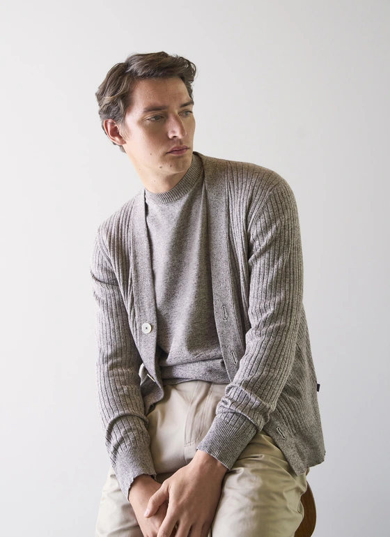 Dieser Strickcardigan aus einer hochwertigen Baumwoll‑Leinen‑Mischung überzeugt durch seine natürliche Struktur und angenehm, zugleich weiche Haptik. Das Material bietet atmungsaktive Leichtigkeit, wirkt temperaturregulierend und sorgt für ein komfortables Tragegefühl zu jeder Jahreszeit. Der Regular Fit schafft eine ausgewogene Silhouette, während die französischen Schultern dem Design eine fließende, moderne Linie verleihen. Ein klassischer V‑Ausschnitt rundet den Look ab und macht den Cardigan vielseitig kombinierbar.