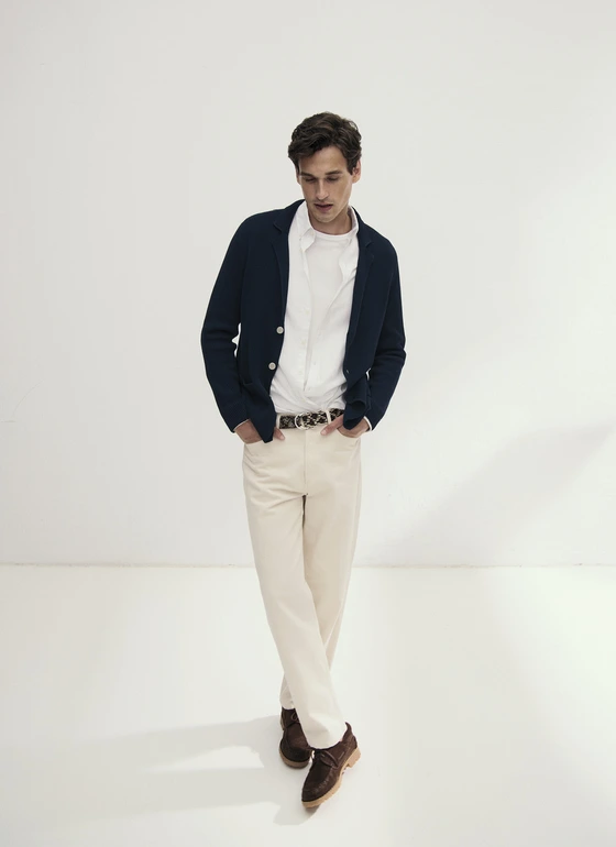 Die Strickjacke aus fein gearbeiteter Baumwolle präsentiert sich mit elegantem Reverskragen, französischen Schultern und markanter Rippenstruktur. Der Regular Fit bietet souveränen Komfort, während eine dezent gestaltete Knopfleiste und zwei großzügige Taschen das anspruchsvolle Design vollenden. Die weiche, natürliche Haptik sorgt für ein angenehm luxuriöses Tragegefühl. Vielseitig kombinierbar – ein stilvolles Essential für gepflegte Alltags‑ und Business‑Looks.