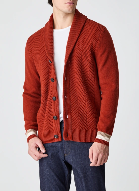 Diese Strickjacke vereint zeitlosen Stil mit modernem Design. Der elegante Schalkragen, das markante Fischgrätmuster auf der Vorderseite und farbige Streifendetails an den Ärmeln verleihen ihr einen unverwechselbaren Look. Hergestellt aus hochwertiger Merinowolle überzeugt sie durch natürliche Temperaturregulierung, Atmungsaktivität und Formstabilität. Ein vielseitiger Begleiter für Männer, die Wert auf Stil, Komfort und Qualität legen.